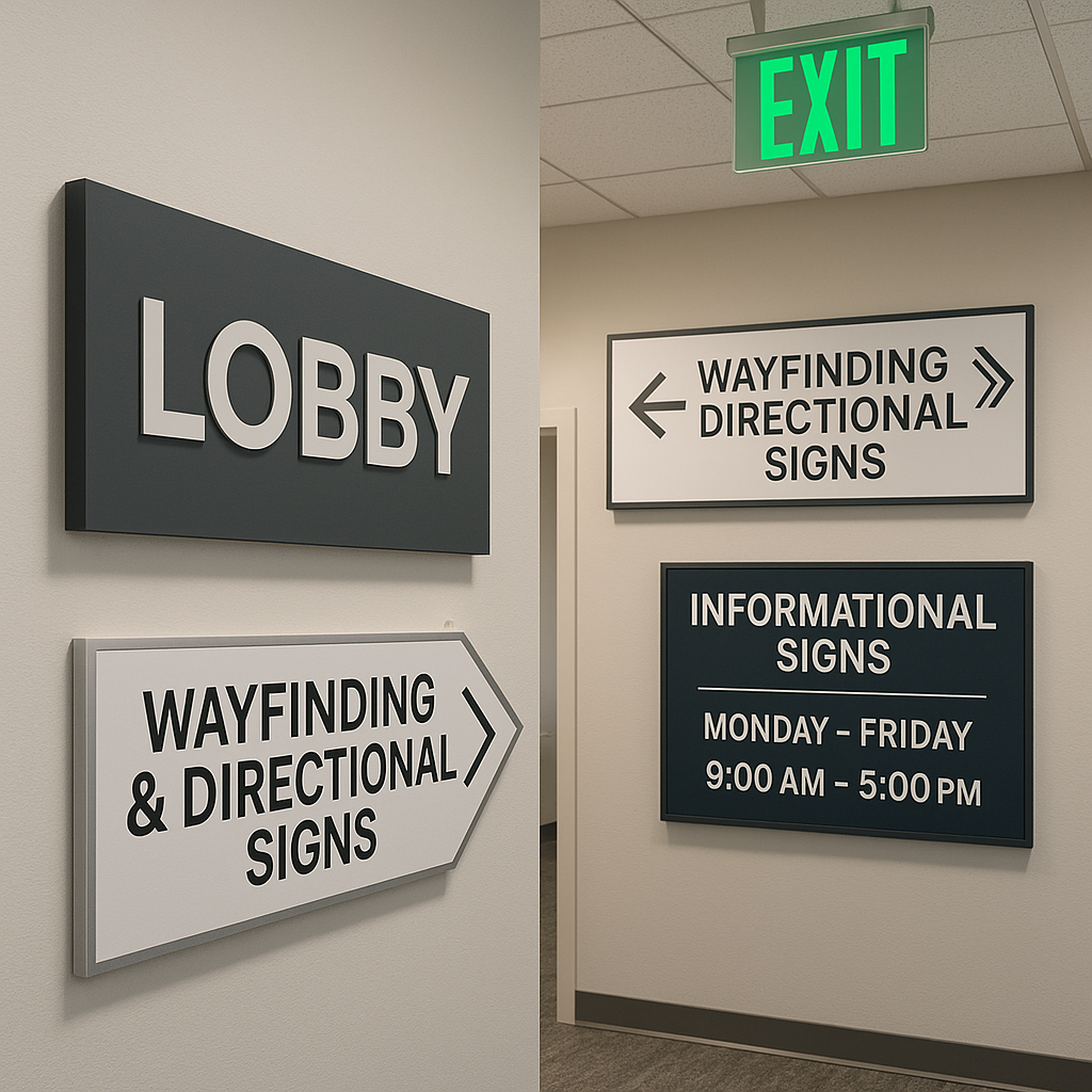 Wayfinding signage helps guide people through spaces, such as offices, hospitals, malls, and airports, improving navigation and customer satisfaction.